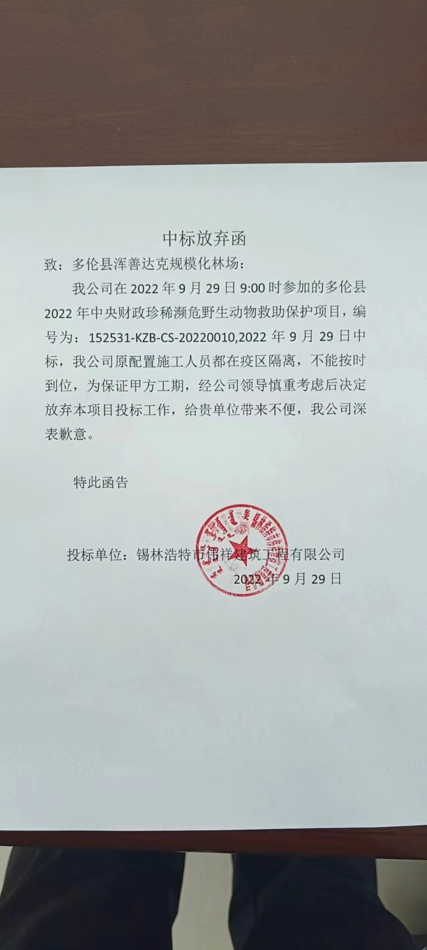 原公告的合同包1(多伦县2022年中央财政珍稀濒危野生动物救助保护项目)中标供应商(第1候选人):锡林浩特市伟祥建筑工程有限公司,更正为:内蒙古久远建设工程有限公司。